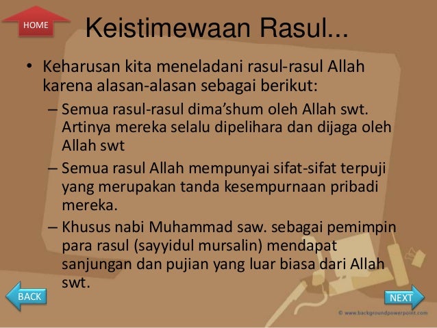 Makalah ini memuat tentang Iman kepada Para Rasul Allah dimana didalamnya di terangkan bagaimana seharusnya kita mengimani keberadaan Rasul-Rasul Allah baik yang di sebutkan maupun yang tidak di sebutkan. Maka dengan hal ini semoga kita semua akan menjadi lebih mengetahui dan lebih memperkuat iman kita terhadap keberadaan Rasul-Rasul Allah. seperti nama-nama dan sifat Allah berita tentang hari kiamat dan lainnya . Memperbaiki membersihkan mensucikan jiwa manusia memperingatkan dari hal yang bisa merusaknya. Hikmah dan Fungsi Iman Kepada Rasul Allah. Adapun fungsi beriman kepada rasul-rasul Allah diantaranya yaitu Wahai orang-orang yang beriman tetaplah beriman kepada Allah dan Rasul-Nya dan kepada kitab yang Allah turunkan kepada Rasul-Nya serta kitab yang Allah turunkan sebelumnya. Barangsiapa yang kafir kepada Allah malaikat-malaikat-Nya kitab-kitab-Nya rasul-rasul-Nya dan hari kemudian maka sesungguhnya orang itu telah sesat sejauh-jauhnya. Makalah Beriman Kepada Kitab Kitab Allah Ayat Dan Hadits Tentang Beriman Kepada Rasul Rasul Allah Brainly Co Id Rpp Pai Xi Kurikulum 2013 Seri 2 3 Iman Kepada K. Makalah Beriman Kepada Kitab Kitab Allah Ayat Dan Hadits Tentang Beriman Kepada Rasul Rasul Allah Brainly Co Id Rpp Pai Xi Kurikulum 2013 Seri 2 3 Iman Kepada K . Mengimani rasul-rasul Allah Swt. adalah kewajiban hakiki bagi setiap muslim karena merupakan bagian dari rukun iman yang tidak dapat ditinggalkan. Sebagai perwujudan iman tersebut kita sebagai muslim yang taat wajib menerima ajaran yang dibawa rasul- rasul Allah Swt. Perintah beriman kepada rasul Allah terdapat dalam surah an-Nisa 4 136 Contoh perilaku beriman kepada Rasul Allah Setiap orang beriman wajib mempercayai keberadaan Rasul Allah SWT. Para Rasul merupakan mausia yang telah dipilih Allah swt mereka diberi wahyu oleh Allah swt untuk disampaikan kepada umatnya. Sebagai seorang yang beriman tentunya anda juga beriman kepada Rasul rasul Allah swt. Ian Kepada Rasul-Rasul Allah 1. XI IIS-1 Oleh Kelompok 1 Bab 4 Iman Kepada Rasul-Rasul Allah SWT. BAB IV Iman Kepada Rasul Tujuan Pembelajaran 3. Menjelaskan Sifat Sifat Rasul 06 Februari 2016 1. Iman kepada Rasul Allah merupakan rukun iman yang ke 4 yang wajib kita percayai dan yakini dan seperti yang kita ketahui bahwa umat manusia sangat sering melakukan perbuatan dosa sejak ribuan tahun lalu.. Rasul diutus oleh Allah untuk membimbing manusia ke jalan yang benar sehingga bisa selamat dunia dan akhirat. pengertian iman kepada rasul. Pertama kita akan membahas mengenai pengertiannya. Iman Kepada Rasul menurut Bahasa Arab merupakan Percaya. Secara istilah atau luasnya iman kepada rasul berarti meyakini dengan sepenuh hati bahwa Rasul itu benar-benar utusan Allah yang ditugaskan untuk membimbing umatnya ke jalan yang benar agar selamat di dunia dan akhirat. IMAN KEPADA RASUL-RASUL ALLAH I. Standar Kompetensi Meningkatkan keimanan kepada Rasul-rasul Allah