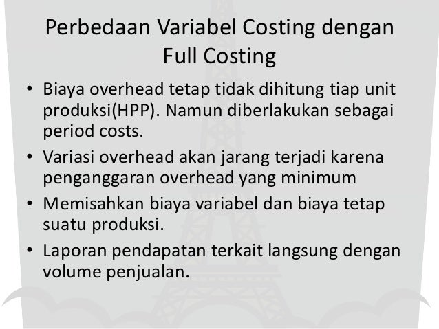 PELAPORAN YANG DISEGMEN DAN PENENTUAN HARGA POKOK PENDEKATAN KONTRIBUSI By Kartika Aji Lukitasari 135020201111085 Slideshare uses cookies to improve functionality and performance and to provide you with relevant advertising. Mulyadi 1993 24 dalam buku Akuntansi Biaya Penentuan Harga Pokok dan Pengendalian Biaya mengemukakan syarat-syarat penggunaan metode harga pokok pesanan sebagai berikut 1. Bahwa masing-masing pesanan pekerjaan atau produk dapat dipisahkan identitasnya secara jelas dan perlu dilakukan penentuan harga pokok pesanan secara individual. Harga Pokok Produksi xxxx 2. Metode Variable Costing adalah metode penentuan harga pokok produksi yang memasukkan semua komponen-komponen biaya produksi seperti Biaya Bahan Baku Baya Tenaga Kerja dan Biaya Overhead Pabrik namun hanya yang bersifat variabel. Sebab dalam metode ini Biaya Produksi Tetap dianggap sebagai Biaya Menentukan Harga pokok produksi mungkin masih agak susah untuk para Pelaku usaha baru. Padahal perhitungan dan penentuan harga pokok produksi sangat penting guna mengetahui penghitungan margin penjualan prediksi laba rugi dan lain-lain.. Dalam Akuntansi biaya biaya digolongkan dengan berbagai cara. Laporan yang disegmen untuk kegiatan intern disajikan secara khusus dalam bentuk kontribusi. Pedoman penentuan harga pokok yang digunakan dalam penyajian laporan ini adalah sama seperti pedoman penentuan harga pokok yang dignakan dalam penyajian laporan jenis kontribusi pada umumnya kecuali satu hal yang tidak sama yaitu terletak pada penanganan biaya tetap. Pengumpulan biaya yang didasarkan padatiap-tiap pemesanan digunakan kartu harga pokok. Dan untuk memudahkan dalam mencatat biaya-biaya langsung ke kartu harga pokok maka nomor order produksi harus dituliskan diatas kartu harga pokok di masing-masing pesanan. Harga pokok per barang yang dihasilkan di dapat dengan cara berikut ini. Harga yang murah merupakan kunci keberhasilan strategi pemasaran perusahaan ditambah dengan jumlah tertentu yang dihasilkan lewat ekspedisi toko secara agresif Pengendalian yang ketat atau persediaan Manajemen tidak pernah terlibat dalam penjualan dan untuk membuat agar konsumen datang kembali karena telah menetapkan harga yang tepat. Laporan yang disegmen untuk kegiatan intern disajikan secara khusus dalam bentuk kontribusi. Pedoman penentuan harga pokok yang digunakan dalam penyajian laporan ini adalah sama seperti pedoman penentuan harga pokok yang digunakan dalam penyajian laporan jenis kontribusi pada umumnya kecuali satu hal yang tidak sama yaitu terletak pada Perhitungan Biaya Biaya Pabrik bahan baku TKL Overhead variabel Overhead Tetap Biaya non-pabrik Administarsi dan Penjualan Biaya Persediaan Barang Jadi Persediaan Barang dalam Proses Persediaan Bahan baku Bahan Langsung yang digunakan dalam produksi Barang selesai harga pokok produksi Biaya Barang terjual Beban Periode 3. LAPORAN SEGMENTASI PELAPORAN YANG DISEGMEN Untuk beroperasi secara efektif manajer harus mempunyai informasi sebanyak-banyaknya yang melebihi dari informasi yang diberikan oleh laporan laba-rugi semata. Beberapa jenis produk dapat menguntungkan dan beberapa lainnya tidak dapat memberikan keuntungan beberapa daerah penjualan mungkin mempunyai komposisi penjualan yang buruk atau mungkin