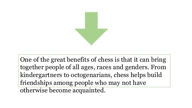 Chess is a fair game it s your kid the board and the other kid no physical contact only the battle of minds. The King of Board Games has much more to surprise us than we ever thought. Still think chess for kids is too hard Check out these surprising facts and benefits of playing chess and then consider your next move. Benefits of Playing Chess with Your Kids 1. Chess helps you Concentrate . It s a reasonably long and involved game. My kids love it so much they get so involved. You can see the gears whirring the clogs ticking. Chess helps your children to come up with original creative thoughts. All those benefits just from playing a game. For kids who aren t interested in entering tournaments just playing for fun still confers all of the game s cognitive benefits. It s a misconception that chess is only for nerdy gifted kids Read our list of the top health benefits of chess to see why. In a district where the average students tested below the national average kids from the district who played the game tested above it. Optimizes memory improvement Chess players know that playing chess improves your memory mainly because of the complex rules you have to Chess Benefits for Kids Complied by Dr. David Poston New Mexico Scholastic Chess Organization February 2010. Most people agree that playing chess is beneficial to children and coaches parents of scholastic chess players usually have first hand evidence to support this conclusion. Mentioned below are some of the most important benefits that children can avail by practicing chess on a regular basis Playing the game of Chess on a regular basis right from the childhood improves the learning thinking analytical power and decision-making ability of the child. Chess gives the brain a rigorous exhilarating workout that s great for both children and adults. Let s take a look at 5 of the most commonly discussed benefits of playing chess along with 2 bonus benefits at the end. Chess is played everyday around the world and brings people of different cultures and backgrounds together. Let s take a look at the top 10 benefits of learning and playing chess Teaches you how to win and lose. Can help you focus. As an educational tool. Chess clubs are a great way for children to get involved in chess. Chess in Schools Urban Chess initiative has so far introduced chess clubs in over 175 schools mainly in inner cities while in some other schools chess clubs are run by a member of staff. Another option is to hire an independent chess tutor. Playing Smart The Benefits of Chess for Kids by Dan Reiner Published October 9 2013 Updated March 20 2020 With National Chess Day being celebrated this Saturday October 12 it s a great time to dust off the board or log on for an online chess game .