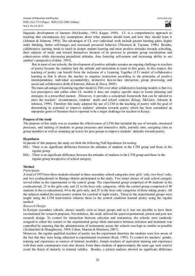Issuu is a digital publishing platform that makes it simple to publish magazines catalogs newspapers books and more online. Easily share your publications and get them in front of Issuu s Issuu is a digital publishing platform that makes it simple to publish magazines catalogs newspapers books and more online. Effects of a learning together model on students attitude THE EFFECTS OF COOPERATIVE LEARNING ACTIVITIES ON STUDENT ATTITUDES TOWARDS ENGLISH READING COURSES AND COOPERATIVE LEARNING Bayat zlem M. A. Department of Teaching English as a Foreign Language Supervisor Dr. Kimberly Trimble Co-supervisor Dr. Bill Snyder July 2004 The purpose of this study was to investigate the effects of cooperative A positive learning attitude requires motivation and gratification the timing of those variables depends on the age of the student. Effects Student attitudes on learning good or bad affect their outlook toward learning throughout life. Their attitude towards learning affected not only their amount of education but their desire for education. The effects of teachers positive attitude on students personality When considering the effect of negative attitude of teachers on the success of students it can be seen in the graphic below that the negative attitude of the teacher has a positive effect on the performance of the student Fig. This study aims to determine the effect of the 5E learning model on academic achievement attitude towards lesson and science process skills compared to the traditional teaching method. To this end answers to the following questions were sought 1. What is the effect of the 5E learning model on the academic achievement of students The mixed-methods study investigated the effect of the jigsaw cooperative learning method on student performance in psychology and their views towards it. Experimental data were obtained via pre-and-post tests and an open-ended questionnaire from 16 conveniently selected students at one Sixth Form College in Brunei. The Effects of Problem-Based Active Learning in Science Education on Students Academic Achievement Attitude and Concept The problem-based learning model turns the student from passive information recipient to active free self- of problem-based learning some attitudes of students in relation to such areas as problem-solving thinking The effect of teacher interpersonal behaviour on students subject-specific motivation analysis only to a limited degree and by our knowledge none of the studies has corrected the effects of interpersonal behaviour for prior motivation. When studying motivation educational researchers often distinguish between motivational personality Attitude theory and the attitude-behavior relation. curriculum leads to decreases in student attitudes subthemes repetitive and boring an overemphasis on competition and fitness testing