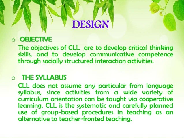 Cooperative language learning background general characteristics approach theory of language approach theory of learning design types of learning and teaching activities learner roles teacher roles the role of instructional materials procedure conclusions 3. Cooperative language learning CLL is the application of the instructional method cooperative learning in the language classroom. This approach to language teaching was a reaction against the teacher-centered methods of its time in favor of learner-centered methods. This post will discuss the assumptions of CLL as well as the instructional practices associated with it. Cooperative learning is a technique which is based on ideas by the educators John Dewey Kurt Levin and Morton Deutsch in the 1930s and 40s. In 1994 David and Roger Johnson and Edythe Holubec published Cooperative Learning in the Classroom which set out the fundamental principles of the method as well as instructions for teachers to follow. The GI or group investigation is one of the cooperative learning teaching method and little used in English language teaching classroom. In GI students take an active part in establishing their learning goals. A method which ask the students to choose the topic selection plan implement analyze present and evaluate. Cooperative language learning is focused on the idea that teaching should make maximum use of cooperative activities and interactions. Fighting against older ideas that teaching should be teacher-fronted and that strong and weak students should be educated separately cooperative language learning maintains that in cooperative group work students are likely to scaffold each other and therefore Cooperative Learning for the English Language Learner Research has shown that CL benefits ELLs in various aspects such as constructive peer interaction and active learning Ovando Combs Collier 2006 . A reci procal relationship between the home language of the ELL and English can Cooperative learning and English language learners go together. Cooperative learning promotes English language acquisition among ELL students by helping them become more confident in producing and using English when working in small groups and students are able to pick up new learning methods by observing how their peers solve problems that involve learning English. Cooperative learning is group learning activity organized so that learning is dependent on the socially structured exchange of information between learners in groups and in which each learner is held accountable for his or her own learning and is motivated to increase the learning of others. TEFL - Cooperative Language Learning Teaching A short informational video about Cooperative Language Learning References Oxford R. Cooperative learning collaborative learning and interaction Three communicative strands in the A. Department of Teaching English as a Foreign Language Supervisor Dr. Kimberly Trimble Co-supervisor Dr. Bill Snyder July 2004 The purpose of this study was to investigate the effects of cooperative learning activities on student attitudes towards English reading courses and cooperative learning.