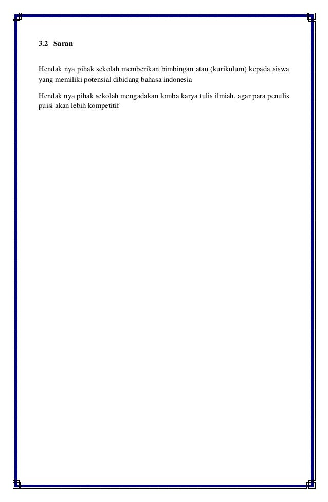 Istilah karya ilmiah dapat disebut pula tulisan ilmiah atau karangan ilmiah yaitu sebuah tulisan yang berisi suatu permasalahan yang diungkapkan dengan metode ilmiah. Artinya pengungkapan permasalahan dalam karya ilmiah itu atas dasar fakta bersifat objektif tidak bersifat emosional dan personal dan disusun secara sistematis dan logis. karya ilmiah memahami makna dari sebuah puisi yang di buat oleh para ahli Slideshare uses cookies to improve functionality and performance and to provide you with relevant advertising. If you continue browsing the site you agree to the use of cookies on this website. Yang di maksud Karya Tulis Ilmiah adalah laporan tertulis yang berisi hasil sebuah kegiatan ilmiah yang dilakukan peneliti. Atau definisi karya tulis ilmiah yaitu tulisan yang membahas permasalahan berdasarkan dari penyelidikan pengamatan maupun pengumpulan data yang berkaitan dengan permasalahan tersebut dan di tulis menggunakan bahasa yang Biasanya bagian ini terdiri dari satu bab saja. Ciri Karya Tulis Ilmiah Reproduktif. Karya ilmiah yang ditulis oleh peneliti atau penulis harus bisa diterima dan dimaknai oleh para pembacanya sesuai dengan makna yang ingin disampaikan. Pembaca juga harus dapat memahami secara langsung konten dari karya ilmiah tersebut. Kesimpulan Bahasa Indonesia ragam ilmiah merupakan salah satu ragam bahasa Indonesia yang digunakan dalam pertemuan dan penulisan karya ilmiah. Dalam bahasa ragam ilmiah memiliki ciri khas yakni cendekia lugas dan jelas menghindari kalimat fragmentaris bertolak dari gagasan formal dan objektif ringkas dan padat dan konsisten. Sebuah karya ilmiah dikatakan sebagai tulisan ilmiah apabila memenuhi syarat-syarat penulisan ilmiah sebagai berikut Wawasan yang diperoleh dari makalah ini setidaknya juga mampu memberikan ruang cakrawala bagi mahasiswa untuk lebih memahami hakikat karya ilmiah dan berbagai hal yang ada di dalamnya. Bahasa Indonesia di Perguruan Pembahasan tentang cara penulisan karya ilmiah sudah banyak buku buku yang ditulis oleh para ahlinya. Pertama pengertian dari karya ilmiah itu sendiri dipaparkan oleh Drs. Abdul Chaer 2011 dalam buku yang berjudul Ragam Bahasa I lmiah nam un dalam pembahasannya kurang spesifik dan lebih menekankan pada cara penulisan kutipan. Karya popular biasanya dalam bentuk media massa media cetak. Bahasa yang digunakan pada karya ilmiah bentuk popular bahasa yang santai dan mudah dipahami isinya factual dan sedang hangat dibicarakan di masyarakat. Kalimat yang digunakan juga santai sederhana lancar dan tida berupa sendau gurau. Bentuk Semi Formal Terdiri dari Karya ilmiah merupakan sebuah tulisan yang berisi suatu permasalahan yang ditulis dan diungkapkan dengan metode-metode ilmiah yang sesuai dengan kaidah penulisan karya tulis ilmiah Home Bahasa Indonesia Karya Tulis Ilmiah Pengertian Tujuan Penulisan suatu karya tulis ilmiah tidak menyimpang dari disiplin ilmu tertentu Budaya atau kebudayaan secara entimologi berasal dari bahasa Sanskerta yaitu buddhayah yang merupakan bentuk jamak dari buddhi budi atau akal yang kemudian diartikan sebagai hal-hal yang berkaitan dengan budi dan akal manusia.Dalam bahasa Inggris kebudayaan disebut culture yang berasal dari kata Latin Colere yaitu mengolah atau mengerjakan atau dapat pula diartikan sebagai mengolah tanah