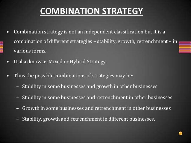 STRATEGY Strategy Greek strat gia art of troop leader office of general command generalship is a high level plan to achieve one or more goals under conditions of uncertainty. Strategy is important because the resources available to achieve these goals are usually limited. Henry Mintzberg from McGill University defined strategy as a Combination Strategy Definition The Combination Strategy means making the use of other grand strategies stability expansion or retrenchment simultaneously. Simply the combination of any grand strategy used by an organization in different businesses at the same time or in the same business at different times with an aim to improve its efficiency is called as a combination strategy. Combination strategy is the combination of any of these strategies at the same time. As such a company might decide to utilize a differentiation and focus strategy at the same time instead of just concentrating on one. The combination could also be between the cost leadership and the focus or any other combination the business deems fit. Combination Strategy is designed to mix growth retrenchment and stability strategies and apply them across a corporation s business units. A firm adopting the combination strategy may apply the combination either simultaneously across the different businesses or sequentially. Combination Strategy or Portfolio Restructuring. By Mustajir Mohammed Combination Strategy or Portfolio restructuring. It is the combination of stability growth retrenchment strategies adopted by an organisation either at the same time in its different businesses or at different times in the same business with the aim of improving its performance. Combination is the act of combining two or more financial instruments or businesses. In the financial context the term combination generally refers to an option trading strategy that involves Drug combination assays and synergism determination. All the chemical compounds were purchased from Selleckchem and dissolved in DMSO to make a 10 mM stock. Cells were seeded at 4000 cells per well in 96-well plates and graded concentrations of drugs with activity against different epigenetic regulators modifiers were added to plates. A combination strategy is the pursuit of two or more of the previous strategies simultaneously. For example one business in the company may be pursuing growth while another in the same company is contracting. In the spring of 1989 for instance Texas Air was rapidly expanding its Continental Airlines unit. Individual strategies in pandemic preparedness plans may not reduce the impact of an influenza pandemic. We searched modeling publications through PubMed and associated references from 1990 to 30 September 2009. Inclusion criteria were modeling papers quantifying the effectiveness of combination strategies both pharmaceutical and non-pharmaceutical. Nineteen modeling papers on combination Corporate level strategy Stability strategies Expansion strategies Retrenchment strategies Combination strategies No change strategies Pause proceed with caution strategies Profit strategies Concentration Integration Diversification Cooperation Internationalization Digitalization Turnaround Divestment Liquidation Simultaneous Sequential Combination of both