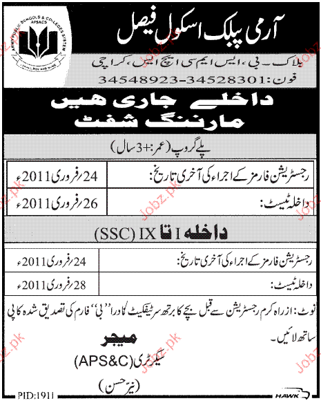 Army Public School - Faisal Karachi Pakistan. 10 067 likes 591 talking about this 2 961 were here. Official page of Army Public School- Faisal Karachi Army Public School Karachi Admission Contact Number and many other details like website fee structure and location are also available on this page as army Public school are the most popular among all schools of karachi Be the first to know and let us send you an email when Army Public School - Faisal posts news and promotions. Your email address will not be used for any other purpose and you can unsubscribe at any time. Army Public School - Faisal February 10 Muhammad Ammar APC Faisal ex student and son of Junior School Urdu Islamiat teacher Ms.Saeeda Sajida has got injured in a road accident today.He is in ICU. Army Public College faisal APC Karachi announced admission 2019 for INTERMEDIATE A-LEVEL Programs. Date 14 April 2019 . Army Public College faisal Karachi has announced admission for session 2019. Applications are invited for follwoing INTERMEDIATE A-LEVEL degree Programs. Please check VACANCIES option in Career APSDK present on the left menu bar to see the advertisement and download the application form. Army Public School Pune Admission 2020-21 Army Public School Pune is one of the famous school which is founded in 1998.The army public school is co-education school and provide a high-quality education with modern techniques and updated methodologies. Jobs in Pakistan Official Govt Jobs Dubai Career Today Newspapers Jobs Pakistan Paper PK 15 March 2020 Work Home Earn Money Online 2021 Admission Open in Admission Open in Army Public School 2020 . Admission Open in Army Public School. Admission Open in Class O-Level and VII in Army Public School Murree. 2019 Upcoming Jobs 2021 Entrance exam is required for admission in Army public school for all classes including prep. Army Public School Karachi Address. Faisal Cant Rashid Minhas Road Gulshan Karachi. Contact with Army Public school for further details like admission procedure fee structure campuses and other details at