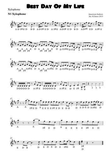 An arrangement of Best Day Of My Life for National 5 and Higher level Xylophone. An arrangement of Best Day Of My Life for National 5 and Higher level Xylophone. Best Day Of My Life - National 5 and Higher Sheet Music. 5 1 customer reviews. Author Created by lospolloshermana. Created Nov 15 2015 FREE Sheet Music PDF for Piano Download and Print Sheet Music PDF. FREE Piano Sheet Music PDF Pop Rock Movie Soundtrack Musical Christmas Jazz NOTHING IS MINE all credit goes to their rightful owners the font is Best Day Ever found on dafont this is my new favorite song so here ya go check out the official music video for Demarco s tune Live My Life Get movin with the KIDZ BOP Kids to Best Day Of My Life Then show us how YOU stay active by posting a video with the hashtag MoveItMarch. Returning customers make sure you re signed in to your Musicnotes Account in order to view all items currently in your shopping cart. 50 videos Play all Mix - American Authors - Best Day Of My Life Official Video YouTube Bastille - Pompeii - Duration 3 53. Finding sheet music for the piano has never been easier and with our extensive catalog you are sure to find what you need. If you are new to the world of digital sheet music we would like to introduce you to the future. At Musicnotes the process is easy. No more going to the store and sifting through stacks of music to find the piece you want. Provided to YouTube by YouTube CSV2DDEX Sail Sail Main Album Version Megalithic Symphony 2011 Red Bull Records Inc Released on 2011-03-31 Auto-generated by Share download and print free Sheet music for piano guitar flute and more on the world s largest community of Sheet music creators.