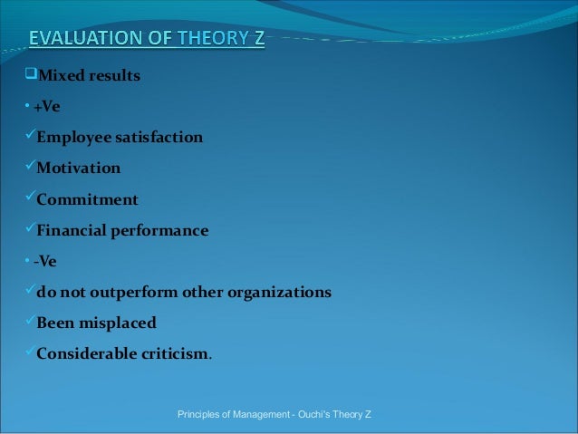 Theory Z of Ouchi is Dr. William Ouchi s so-called Japanese Management style popularized during the Asian economic boom of the 1980s.. For Ouchi Theory Z focused on increasing employee loyalty to the company by providing a job for life with a strong focus on the well-being of the employee both on and off the job. Theory Z is a name applied to three distinct psychological theories. One was developed by Abraham H. Maslow in his paper Theory Z and the other is Dr. William Ouchi s so-called Japanese Management style popularized during the Asian economic boom of the 1980s. The third was developed by W. ADVERTISEMENTS William Ouchi s Theory Z of Motivation Features and Limitations William Ouchi developed Theory Z after making a comparative study of Japanese and American management practices. Theory Z is an integrated model of motivation. Theory Z suggests that large complex organisations are human systems and their effectiveness depends on the quality of humanism used. The theory Z also assumes that employees trust that they can carry out their work properly with the right support from management. McGregor Theory X and Theory Y. Ouchi s Z theory adds an extra component to the McGregor Theory X and Theory Y of social psychologist Douglas McGregor who formulated his theory in the seventies. The X theory American professor and author William Ouchi developed theory Z after a comparative study of American and Japanese management practices popularized during the Asian economic boom in the 1980s. During this study William Ouchi identified various traits of Japanese leadership that formed the basis for a new leadership theory Theory Z. Ouchi s theory first appeared in his 1981 book Theory Z How American Management Can Meet the Japanese Challenge. The benefits of Theory Z Ouchi claimed would be reduced employee turnover increased commitment improved morale and job satisfaction and drastic increases in productivity. The management theory of William Ouchi often called the Japanese method of management adds an extra component to the X and Y Theories of Douglas McGregor. Dubbed Theory Z because of this relationship Ouchi s management model goes farther than McGregor s Y Theory. Theory Z was introduced by William Ouchi in the 1980s Rice University N.D. . Theory Z combined common management ideas from Japan and the United States with the purpose of increasing the employees motivation and loyalty. Theory Z built on and expanded MacGregor s Theory X and Theory Y. Theory Z is a name for various theories of human motivation built on Douglas McGregor s Theory X and Theory Y.Theories X Y and various versions of Z have been used in human resource management organizational behavior organizational communication and organizational development.